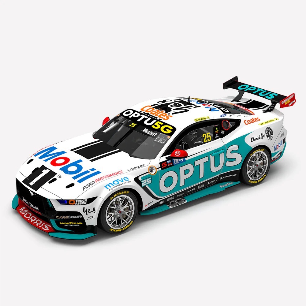 1:43 Scale. Chaz Mostert. Ford Mustang GT. MOBIL 1 Optus Racing #25. 2024 Bosch Power Tools Perth SuperSprint Race 9 Winner (First Ford Win for WAU)