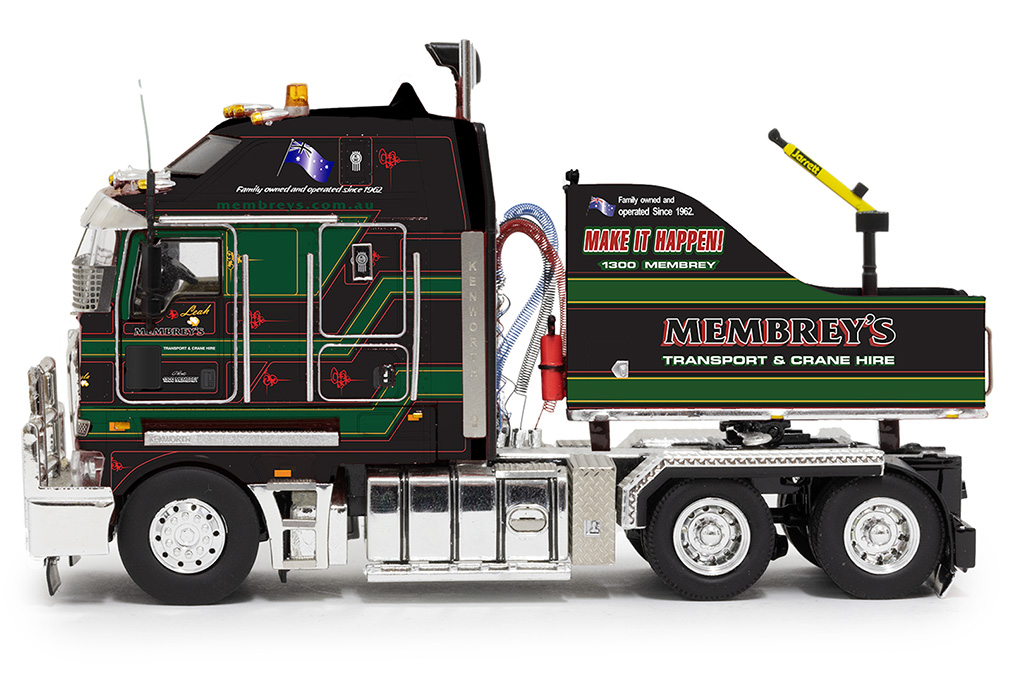 1:50 Scale. Membrey’s Transport & Crane Hire Kenworth K200 “Phat Cab” in Satin Black