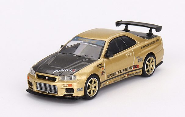 1:64 Scale. Nissan Skyline GT-R (R34) Top Secret Gold Japan Exclusive. RHD. MINI GT