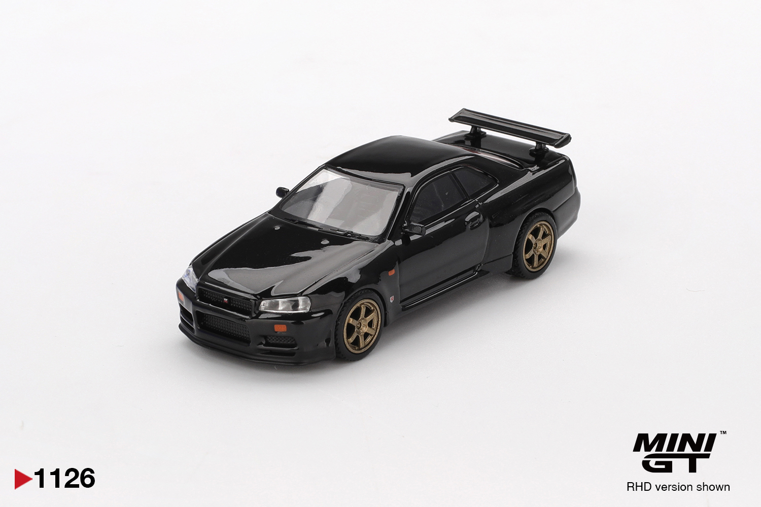 1:64 Scale. Nissan Skyline GT-R (R34) V-Spec. Black Pearl W/TE37 Wheel. MINI GT