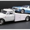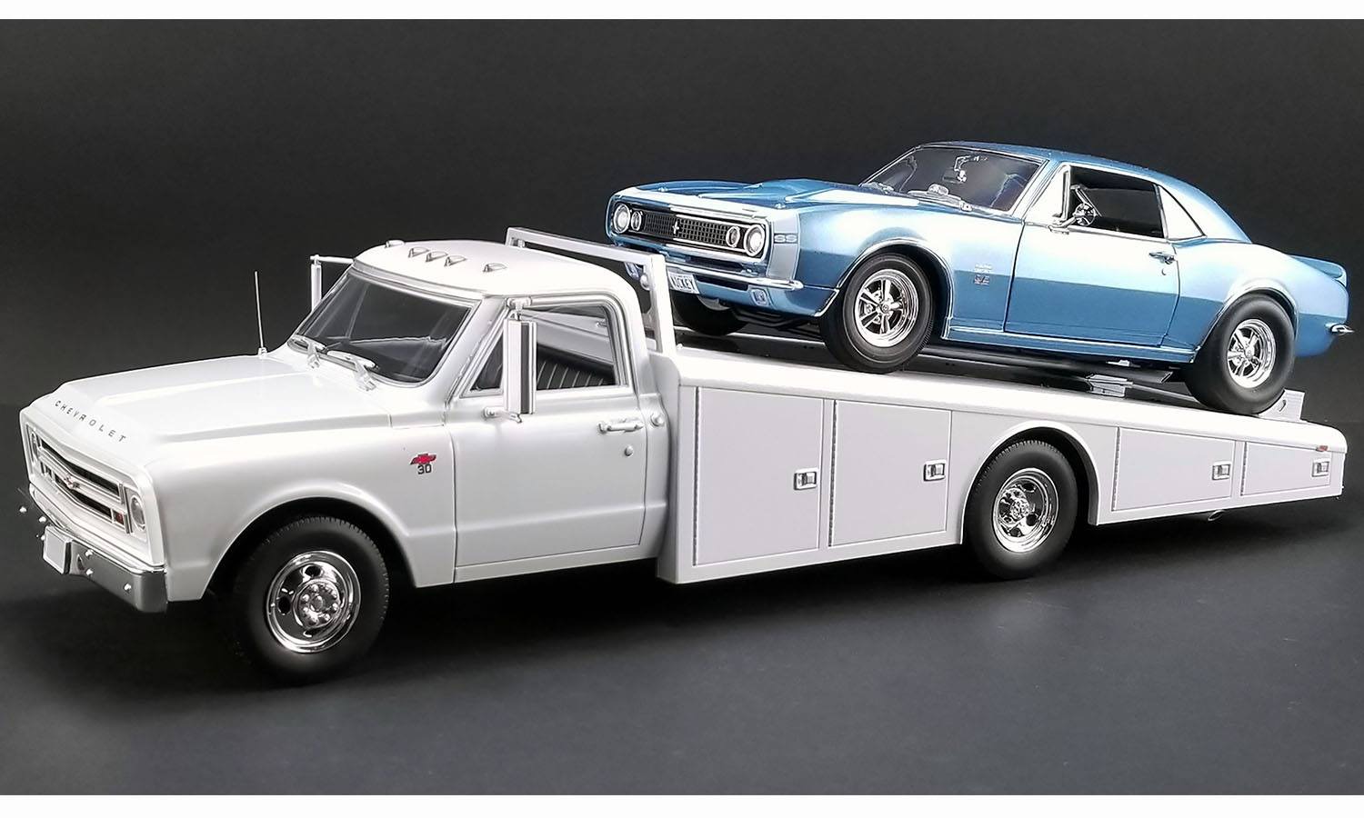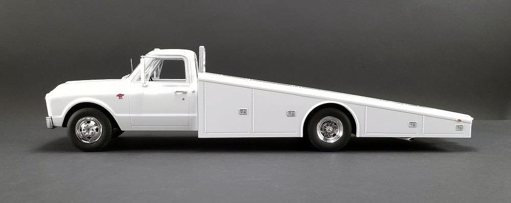 Brimming with fanatical attention to detail! This 1967 Chevy C30 Ramp Truck strikes a commanding presence at 17 inches long. This diecast model made by Acme models features poseable steering, slide out ramps, rubber tyres and fully detailed sealed chassis.