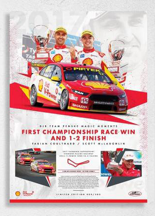 Fabian Coulthard’s arrival at DJR Team Penske in 2016 helped build the foundations for sustained success for the team which was further enhanced when Scott McLaughlin and Ludo Lacroix arrived ahead of the 2017 season. So it’s fitting that it was Coulthard who claimed the first championship race win under the DJR Team Penske banner at the Tasmania SuperSprint in 2017 with McLaughlin hot on his tail to also record the team’s first 1-2 finish. While it was the first championship race win for the team after Dick Johnson Racing joined forces with Team Penske, it was the 82nd victory in the history of DJR – at the same track Dick Johnson claimed his maiden Australian Touring Car Championship race win in 1981.This is a brilliant print capturing this magic moment for the team featuring a range of amazing graphic imagery and details printed with offset print technology on 250gsm matte paper stock.