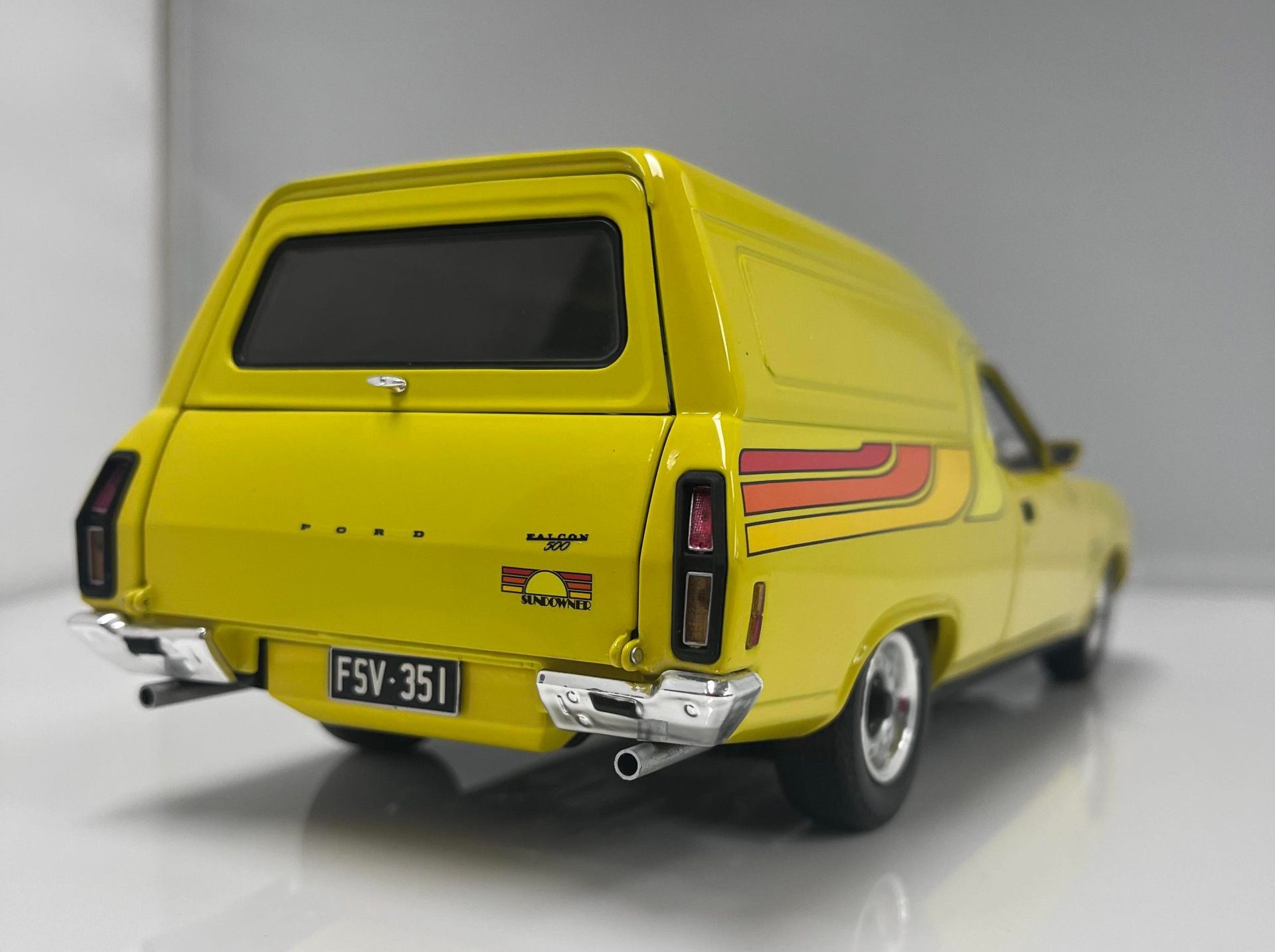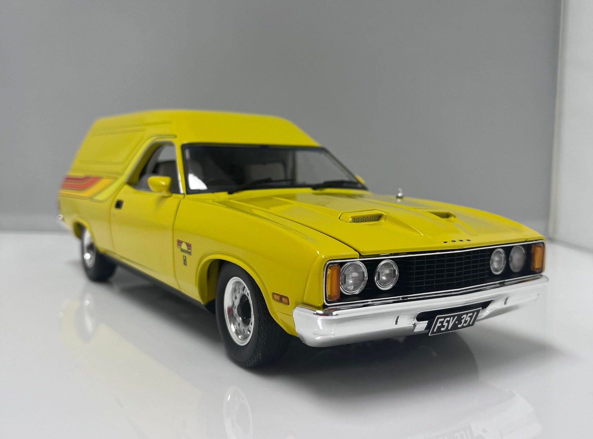 1:18 scale. The Sundowner featured the GS grille, bonnet and interior, equipped with the optioned up GT Power Pak, a 351 V8 with 4 speed transmission, 4 wheel disc brakes and opening doors and bonnet.
