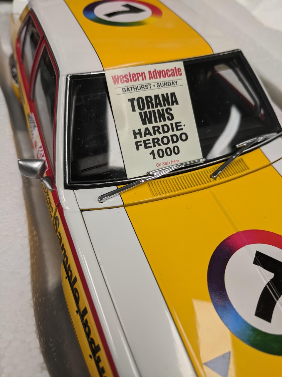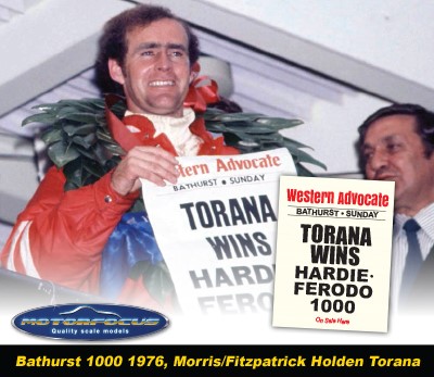 Newspaper covers were a real feature on many Bathurst podiums. Designed to rub more salt into the wounds of the opposition, the covers were proudly held up by the winning drivers. We have had these historic newspaper covers produced in 1:18 scale so you add them to your model display. This great newspaper cover is for use with the Bathurst 1000 1976, Morris/Fitzpatrick Holden Torana.