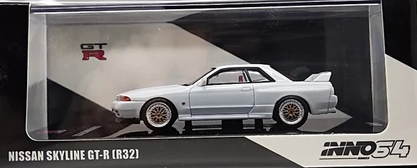 1:64 Scale. Nissan Skyline GT-R (R32) in Crystal White, with extra wheels and extra decals.